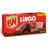 Profitez des Biscuits Bn Lingo Choco en lot de 12. Un goût authentique de chocolat, parfait pour accompagner vos pauses gourmandes. Produit halal.Fourrage au chocolat noir (25,7%) [sucre, matière grasse végétale (palme), maltodextrine, purée de noisettes, humectants (sorbitol, glycérol), poudre de cacao maigre, amidon (maïs), sirop de sucre inverti, lait écrémé en poudre, chocolat noir (2,1%) (pâte de cacao, beurre de cacao, beurre concentré (lait), émulsifiant (lécithine de soja), émulsifiant (E471), stabilisants (E460, E466), conservateurs (sorbate de potassium), régulateur d’acidité (acide citrique), sel, aromes] - matière grasse végétale (palme) - sucre - œufs entiers pasteurisés - farine de blé - sirop de sucre inverti - amidon (maïs) - maltodextrine - poudre de cacao maigre - hume
